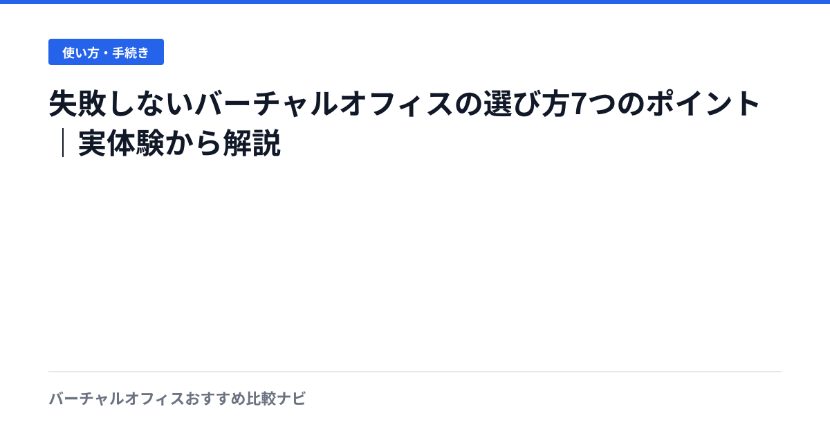 バーチャルオフィスの選び方を7つのポイントで解説。料金・法人登記・郵便転送・拠点など、実際に契約した経験から「ここを見るべき」を整理した。